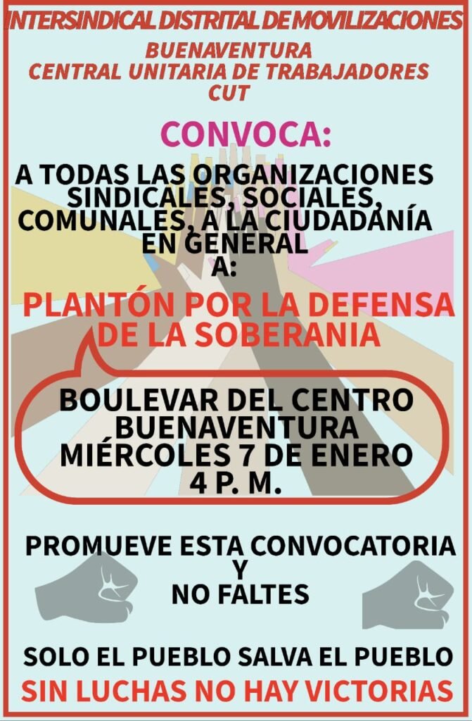 La Central Unitaria de Trabajadores (CUT), ante esta situación de presión y agresión verbal desde el exterior, convoca a toda la ciudadanía colombiana, especialmente en el distrito de Buenaventura, a un plantón masivo en defensa de la democracia y la soberanía nacional.